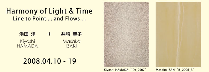 In contrast, the tone of Izaki's work is faint and pale as the fog, and the paint is thin as the film that seems to be transparent. There are faint and soft tone flows like semitransparent veils soundlessly. And the piled up flows make stripes. That realise us the invisible depth of the surface. The work make our sight to round "Behind of Surface" and to read extensively "Depth of the Surface". Finally, turns reversely and sends us to the hither of screen. In that point, the elements of Izaki's works are similar to the Hamada's.